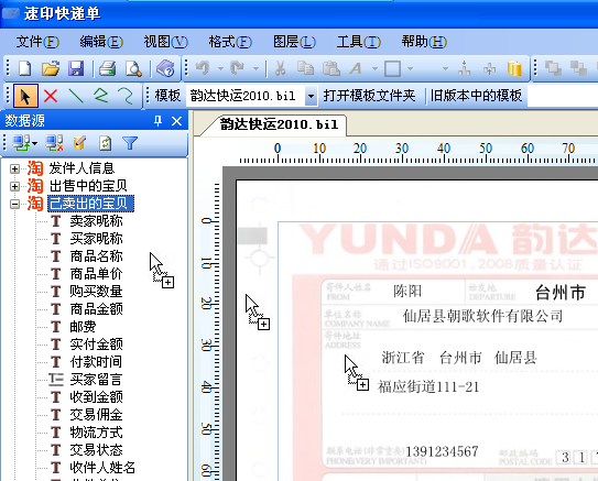 从数据源面板中拖放一个项目到快递单中,我们就完成了一个快递单项的增加,是不是很简单。对就是这么方便简单。